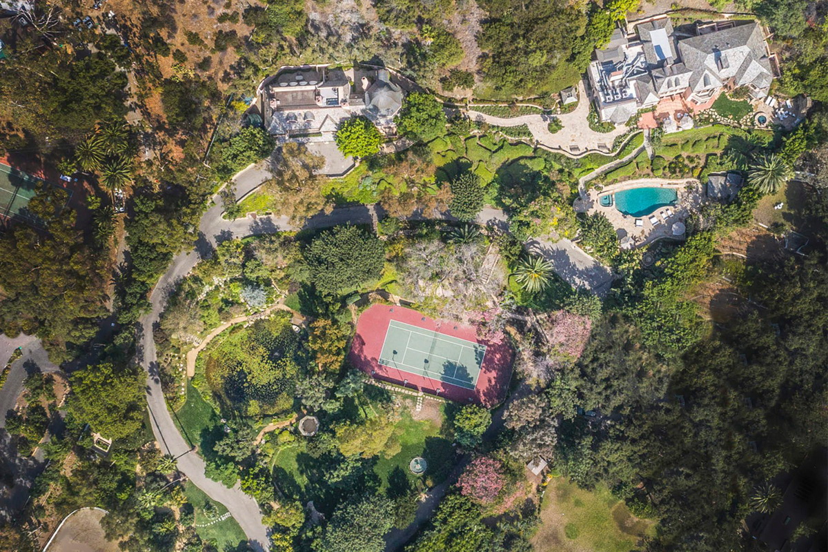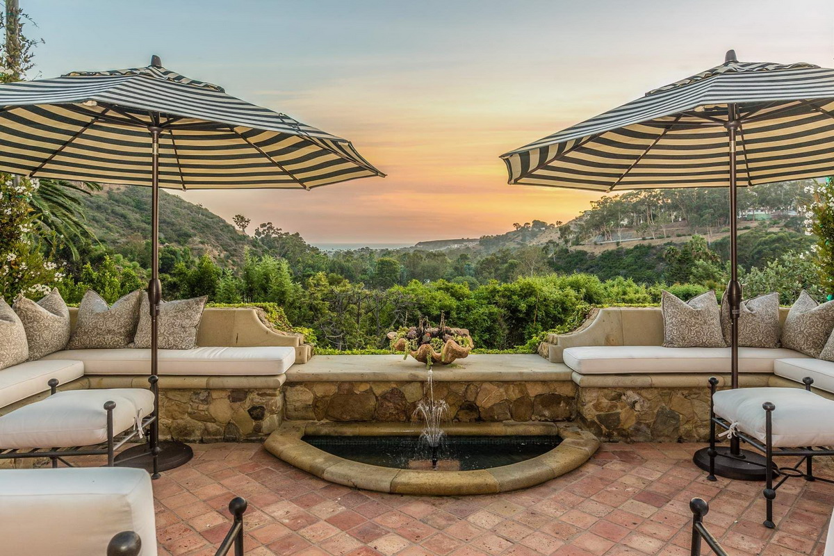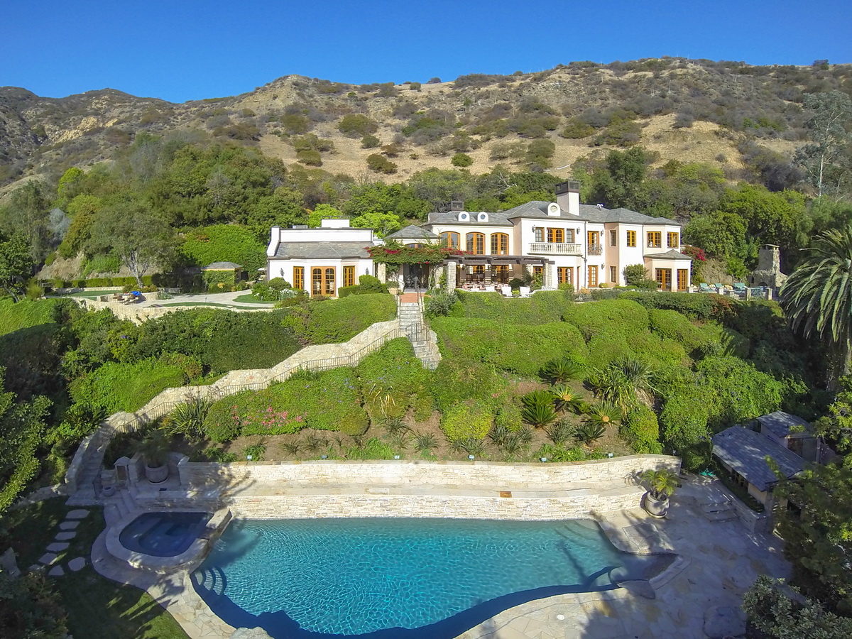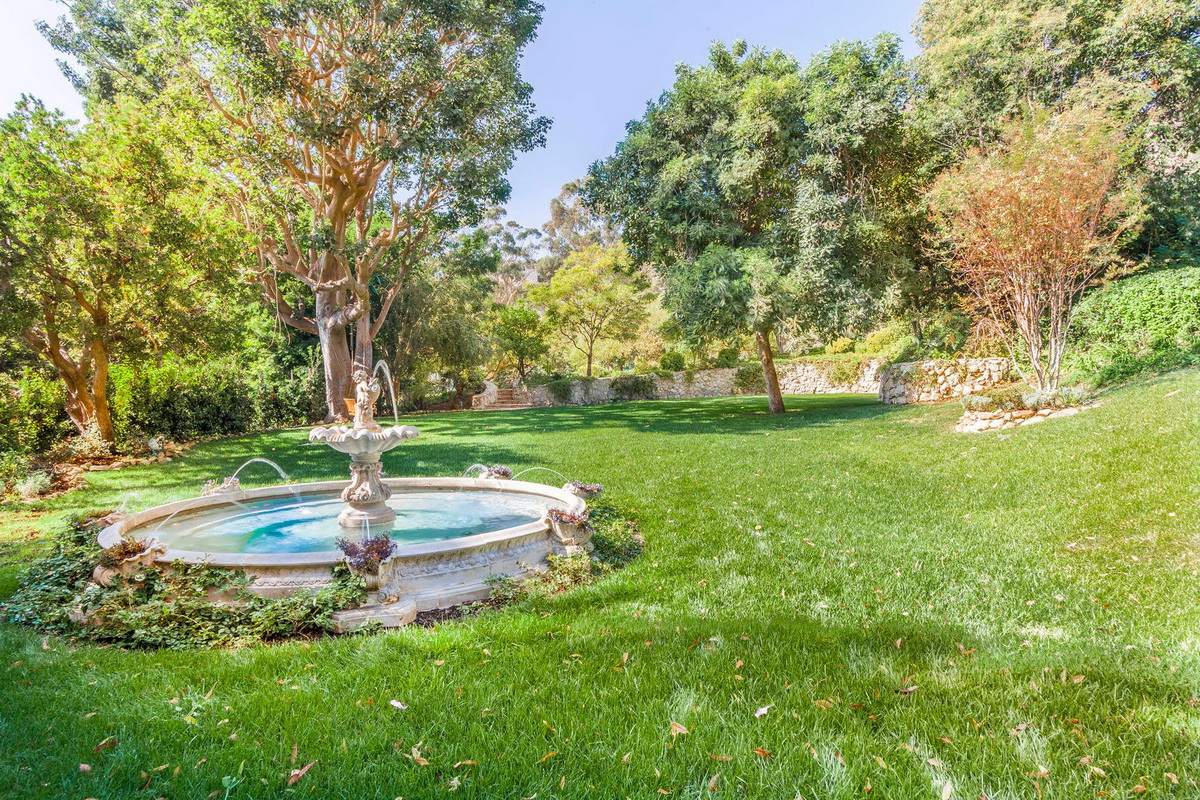 It is the only property in Malibu with close to 5 acres including a 6 stall equestrian facility and riding ring, lighted tennis court and viewing terrace, Monet lily pond, fruit orchard, waterfalls, a large manicured lawn hidden in a grotto, a resort caliber pool and bath house, 2 outdoor spas, outdoor fireplace, BBQ area, multiple French fountains, a 17th century architectural stone antiquity, rose garden, organic vegetable garden, stone terraces, and quiet walking footpaths. Out buildings include a carriage house, security outpost, a movie theater, a two story old world ballroom with a crystal chandelier, 2 elaborate guest suites with private fireplaces and courtyards, an exercise studio, staff facilities, and star gazing deck.