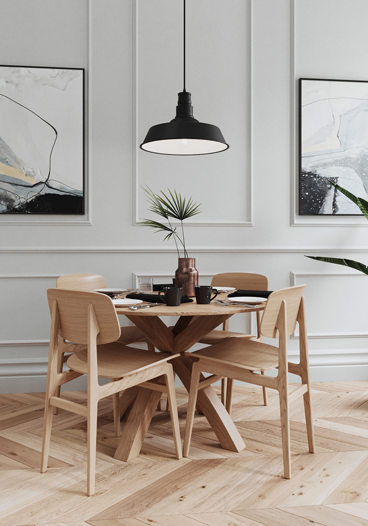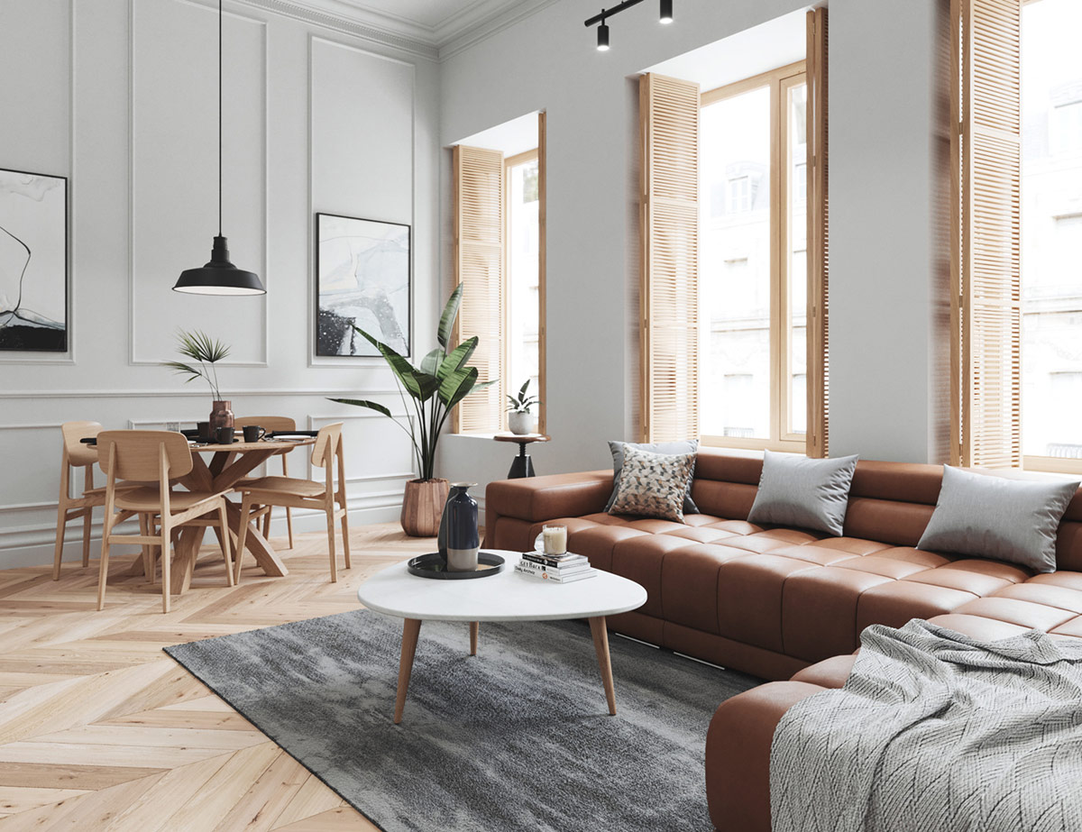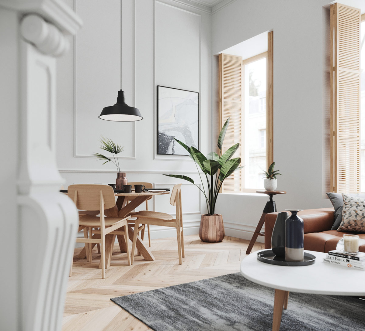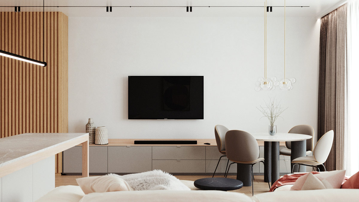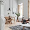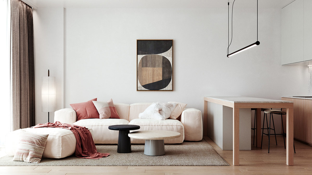 An elegant dance of colourful accents has been choreographed through these four stylish home interiors, creating uplifting moments that are harmonious with a neutral stage. White and natural wood tone provide a clean modern base for brighter accents, whilst black elements instill weight and confidence. Modern furniture and contemporary textiles build layers of simple comfort that appear effortless and homey. Being realistically proportioned, this collection of home designs supply practical decor and layout inspiration for the standard home: Find welcoming living room designs with flair, inspiration for attractive room dividers, creative use of space in kitchen and dining areas, cosy bedroom ideas and striking compact bathroom designs.