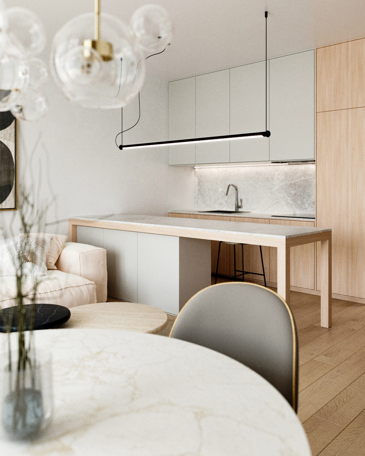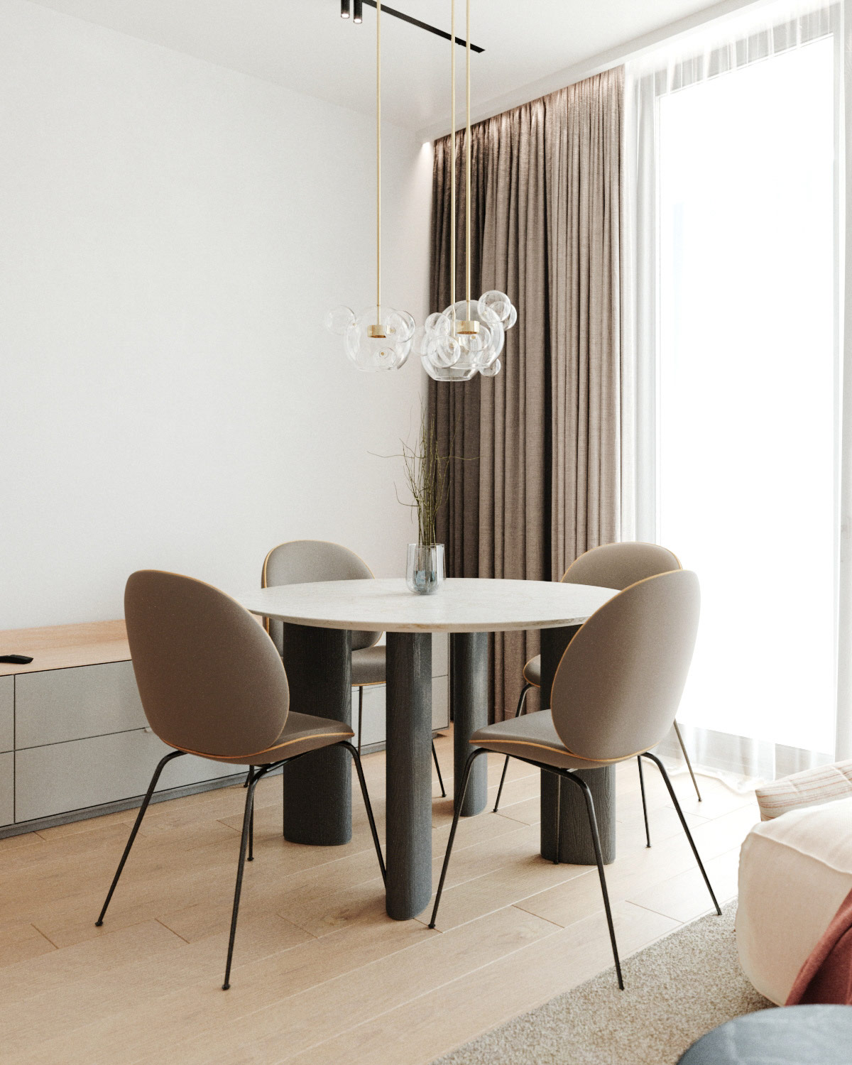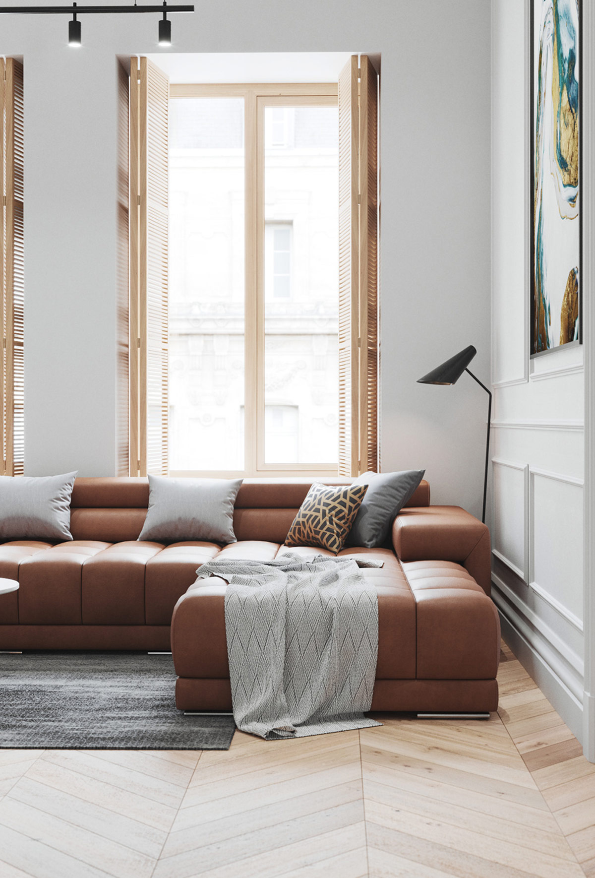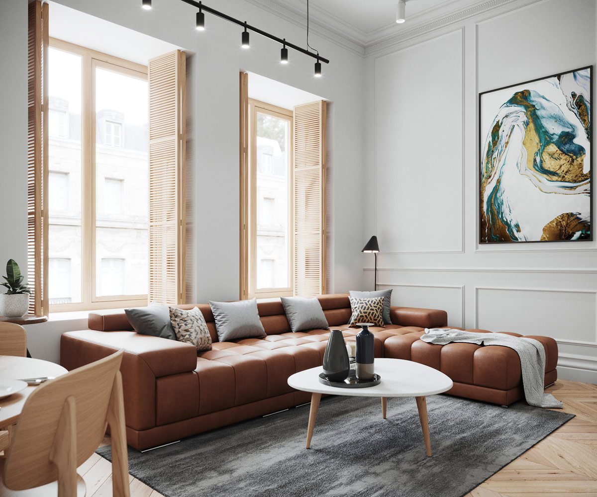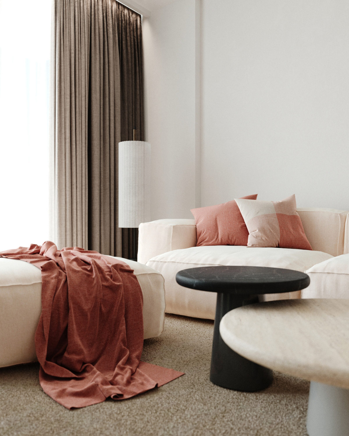 An elegant dance of colourful accents has been choreographed through these four stylish home interiors, creating uplifting moments that are harmonious with a neutral stage. White and natural wood tone provide a clean modern base for brighter accents, whilst black elements instill weight and confidence. Modern furniture and contemporary textiles build layers of simple comfort that appear effortless and homey. Being realistically proportioned, this collection of home designs supply practical decor and layout inspiration for the standard home: Find welcoming living room designs with flair, inspiration for attractive room dividers, creative use of space in kitchen and dining areas, cosy bedroom ideas and striking compact bathroom designs.