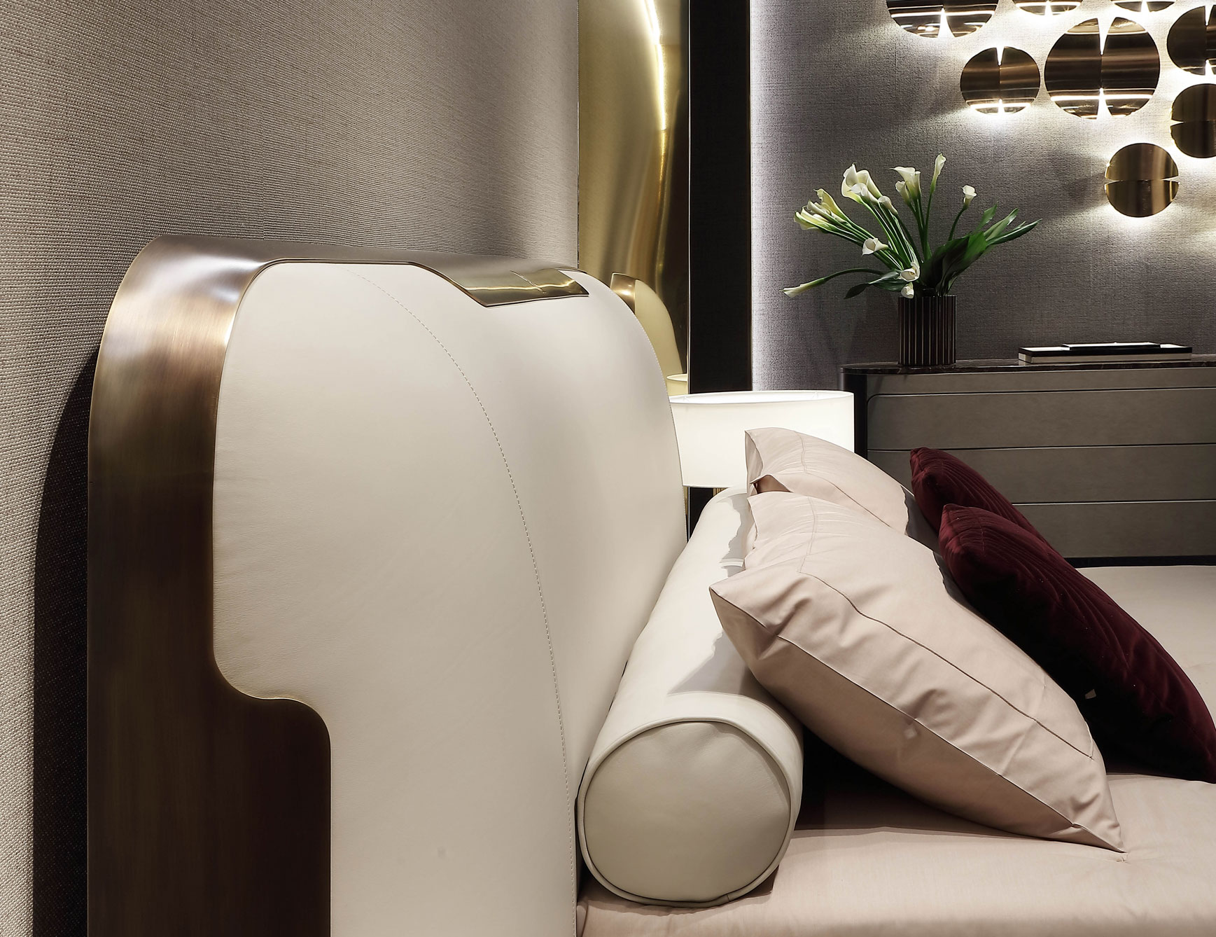 Cover luxury Italian bed shown in cream upholstered smooth leather. Bed slats widths: 60″x80″ (queen) and 76″x80″ (king). Metal structure available in bronze. This luxury Italian furniture collection combines high-end materials in wood and metal with fine leather and fabric upholstery. A wide variety of fabrics and leather are available to choose from (samples available upon request). Made in Italy.